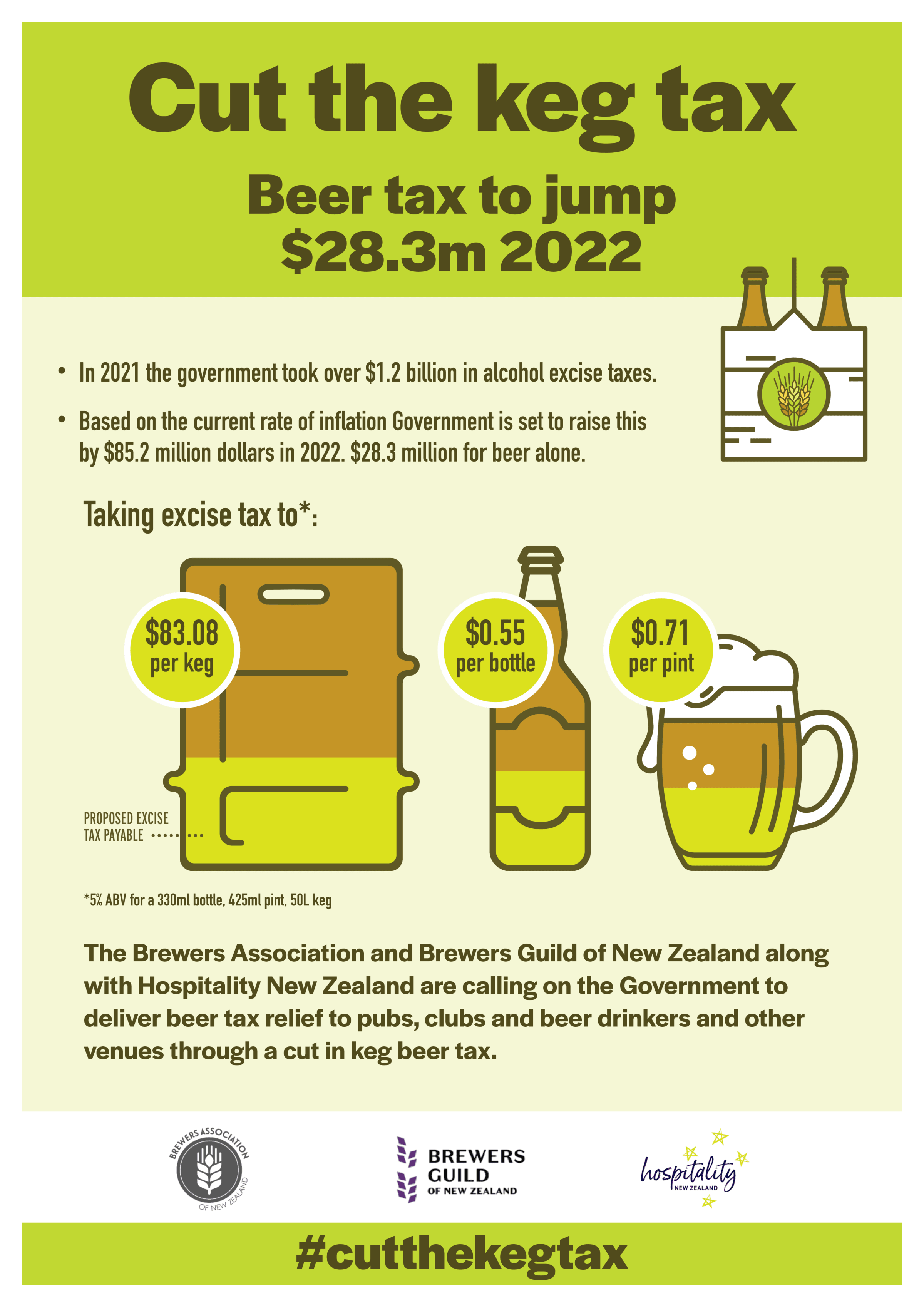 The Brewers Association and Brewers Guild of New Zealand, along with Hospitality New Zealand are calling on the Government to deliver beer tax relief to brewers, pubs, clubs, other venues, and beer drinkers through a cut in kegged beer tax.